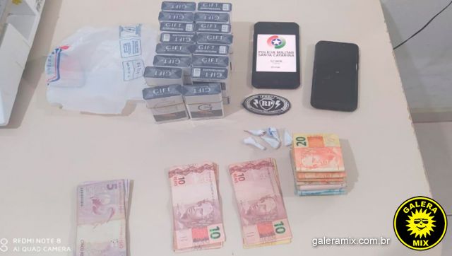 Buscas foram realizadas e de acordo com a PM dentro de um casaco 5 petecas de substâncias semelhante a cocaína e uma quantia de R$ 4.670 em espécie e 16 maços de cigarro de marca Gift, oriundo do Paraguai, foram localizados.
