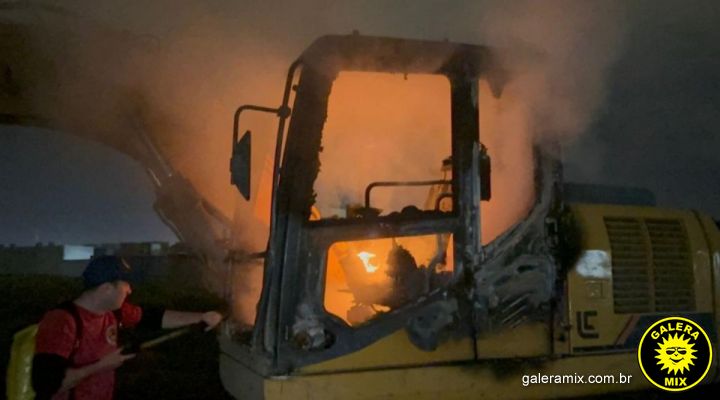 A máquina foi deixada no local para evitar transporte noturno e retomar trabalhos no dia seguinte. Equipes da prefeitura e o Corpo de Bombeiros foram acionados, controlando o fogo sem feridos.