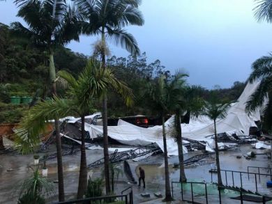 Eleito cinco vezes o melhor clube do mundo, a Green Valley, em Camboriú, teve sua estrutura da tenda derrubada pelos ventos nesta terça-feira (30). Em uma foto, é possível ver a estrutura da Green Valley no chão. Este ano, o clube foi eleito o melhor do mundo pela quinta vez. O ranking é publicado pela revista britânica DJ Mag, que lista anualmente os 100 melhores clubs do planeta.
