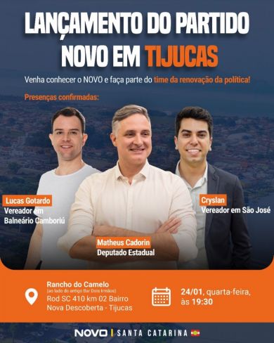 Na próxima quarta-feira, 24 de janeiro, acontecerá o lançamento oficial do Partido NOVO no município de Tijucas.