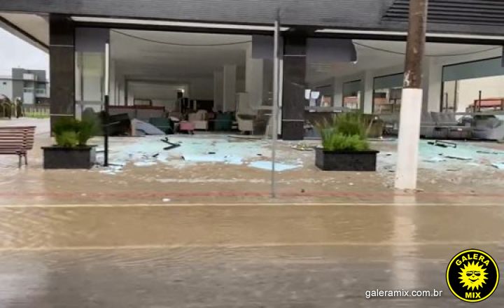 A fachada de uma loja de móveis ficou destruída pelas rajadas de vento na cidade de Porto Belo. Os vidros do local foram encontrados caídos no chão na manhã desta quarta-feira (10).