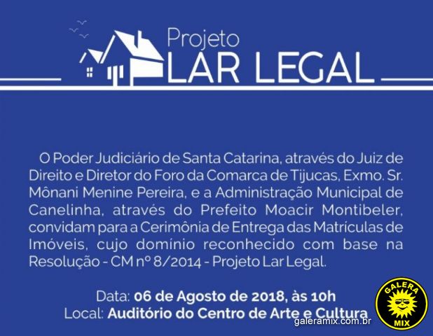 Na próxima segunda-feira, 06 de agosto, o Poder Judiciário de Santa Catarina, através do Juiz de Direito e Diretor do Foro da Comarca de Tijucas, Exmo. Sr. Mônani Menine Pereira, e a Administração Municipal de Canelinha, através do Prefeito Moacir Montibeler, entregarão 47 escrituras públicas para famílias do município por meio do Projeto Lar Legal.