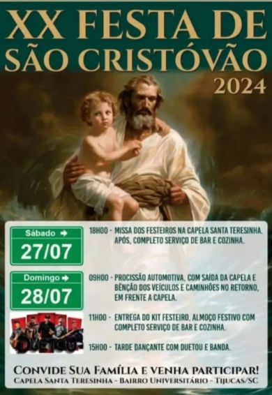 A cidade de Tijucas vai iniciar neste sábado (27), a partir das 18h, as festividades em homenagem a São Cristóvão, conhecido como o protetor dos motoristas, caminhoneiros e viajantes. O evento, que ocorre anualmente e tem grande tradição na localidade, será realizado na Capela Santa Teresinha, situada no Bairro Universitário.