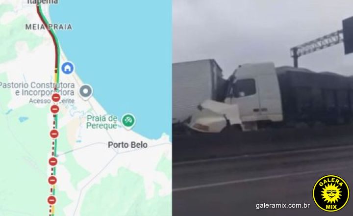 Um acidente envolvendo uma carreta, um caminhão e um ônibus causou um bloqueio total das faixas da BR-101 no sentido Sul, em Porto Belo, nesta quinta-feira (21). Segundo informações preliminares, o motorista da carreta não percebeu o congestionamento à frente e acertou a traseira de um caminhão, que bateu contra um ônibus.