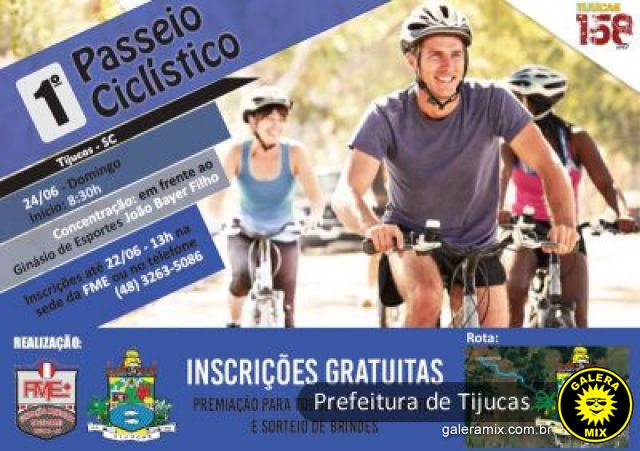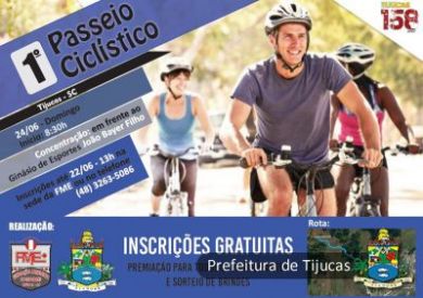 A Fundação Municipal de Esportes (FME) promove, no próximo dia 24 (domingo), o Primeiro Passeio Ciclístico de Tijucas. O evento faz parte das comemorações dos 158 anos da cidade. As inscrições são gratuitas e devem ser feitas na sede da FME até às 13h do dia 22 (sexta-feira) ou pelo telefone (48) 3263-5086.
