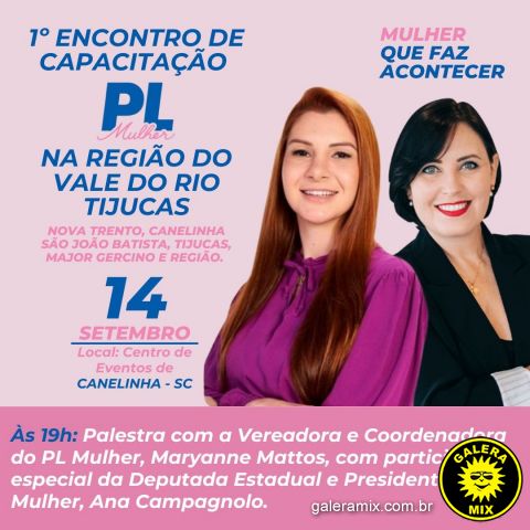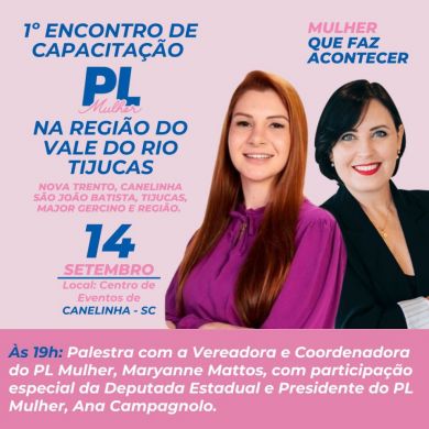A Comissão Executiva do PL juntamente com as presidentes do PL Mulher da região do Vale do Rio Tijucas (Nova Trento, São João Batista, Canelinha, Tijucas e Major Gercino ) alinharam um importante encontro que acontecerá no mês de setembro, com a participação da Deputada Estadual e Presidente do PL Mulher de Santa Catarina, Ana Campagnolo. A Comissão definiu também mais quatro encontros com a participação de outras lideranças, a médio e longo prazo, até 2024. As cinco cidades do Vale estão alinhadas com as diretrizes Nacional e Estadual, visando atingir os objetivos que regem as bandeiras do Partido Liberal (PL). Assim sendo, convidam toda a comunidade, filiados e simpatizantes para prestigiarem o Primeiro Encontro de Capacitação do PL Mulher na Região do Vale do Rio Tijucas, dia 14 de setembro, quinta feira, às 19 horas, no Centro de Eventos Arthur Adolfo Jachowcz em Canelinha. O evento contará com palestra da vereadora e coordenadora regional do PL Mulher (Granfpolis), Maryanne Mattos. No período da tarde haverá capacitação exclusiva para as executivas do PL Mulher e lideranças locais.