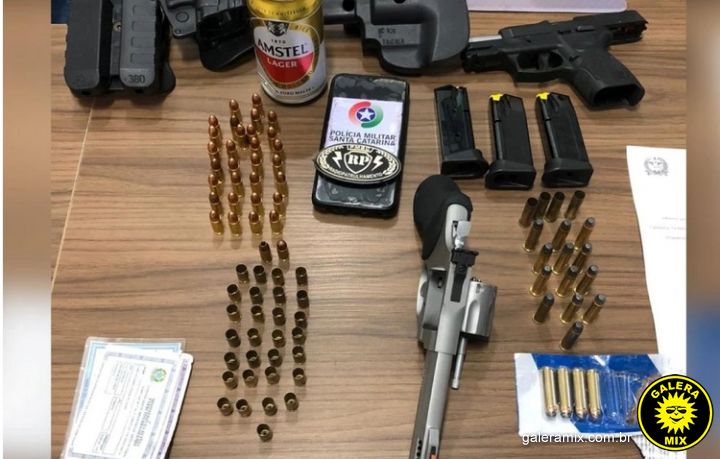 Após apreender a arma de fogo, os agentes prosseguiram até a casa dele, onde tiveram a entrada permitida por sua esposa. Lá, foram encontrados uma pistola municiada, 33 estojos com munições, dois coldres, um porta carregador duplo e três carregadores de arma de fogo.