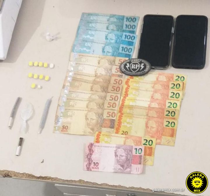 O casal foi preso e algemado após resistência inicial. Durante a revista, foram apreendidos: 02 iPhones, R$ 900 em dinheiro (4 notas de R$ 100, 7 notas de R$ 50, 7 notas de R$ 20 e 1 nota de R$ 10), 11 comprimidos de êxtase, 01 bucha de cocaína e 03 cigarros de maconha.