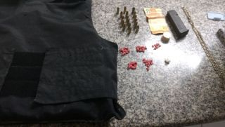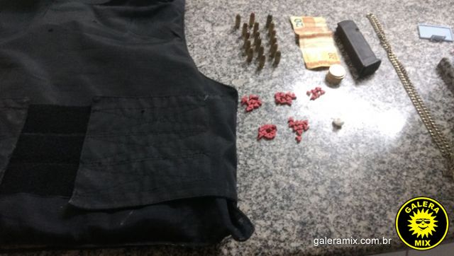 Ainda foram apreendidos 1 colete balístico, 1 carregador Glock 9mm, 16 munições 9mm, 1 munição 40, 46 comprimidos de Ecstasy, 1 peteca de cocaína e R$ 29.
