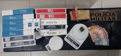 Os policiais militares que estavam à paisana pediram apoio guarnição de serviço caracterizada que abordou Antônio, o qual, após a revista em seu bolso foi localizado um torrão de maconha, sendo que de pronto Antônio confessou ter mais drogas no interior da residência, vindo a guarnição a localizar um tablete de aproximadamente 600 gramas de Maconha, mais 152 reais em espécie, além de 2 balanças de precisão e ainda vários pacotes fechados de cigarro contrabandeados.