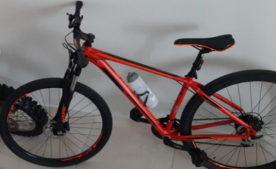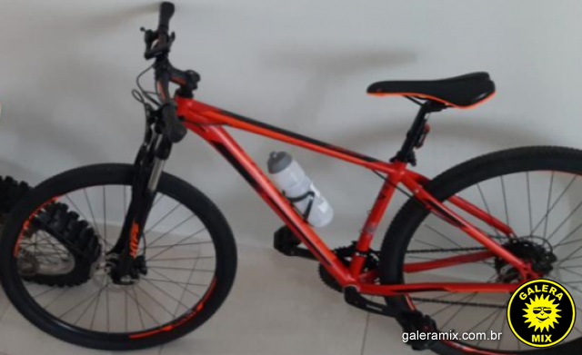 Após retirar a bicicleta furtada ele pega a sua e foge tranquilamente levando a bicicleta de cor vermelha que acaba de furtar.