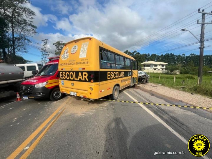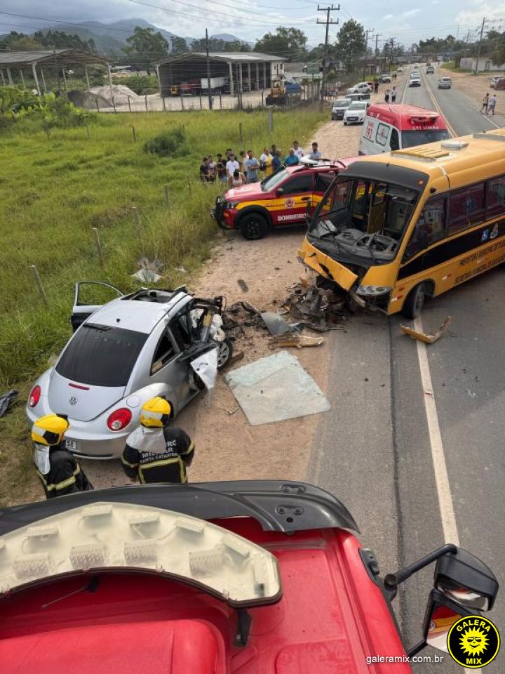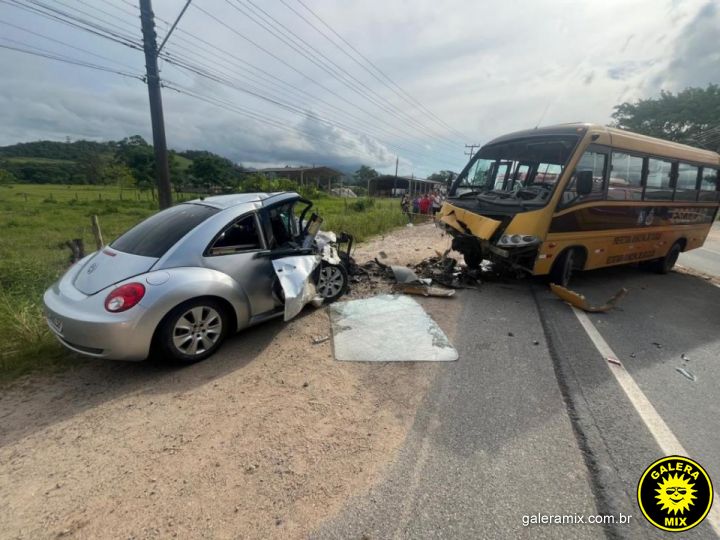 Um grave acidente de trânsito envolvendo um VW New Beetle e um ônibus escolar foi registrado na tarde deste sábado, 15 de fevereiro, na Rodovia SC-410, no bairro Nova Descoberta, em Tijucas. A colisão frontal ocorreu por volta das 16h19 e resultou na morte do motorista do carro.
