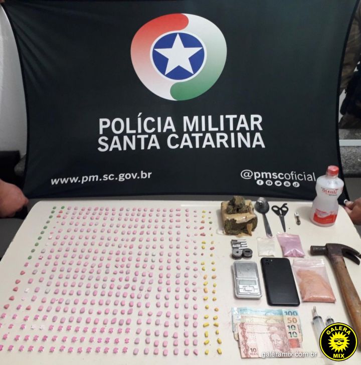Visto que todas as denúncias se confirmaram, a guarnição foi até a residência do mesmo, na rua Moçambique, na cidade de Balneário Camboriú e, no local, encontraram em cima da geladeira uma caixa de papelão com grande quantidade de drogas: 460 comprimidos de ecstasy; 280gramas de maconha; um celular; uma balança de precisão; formas, martelo e matéria prima para fabricação de ecstasy e R$ 170,00 reais.