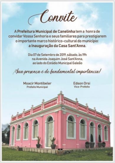 A Prefeitura de Canelinha está finalizando os últimos detalhes da reforma da Casa de Santana, “a casa rosa”. A Solenidade de Inauguração deste importante marco histórico-cultural do município está marcada para o dia 07 de setembro (sábado), com início às 19 horas, com a apresentação dos Violeiros Batistenses.