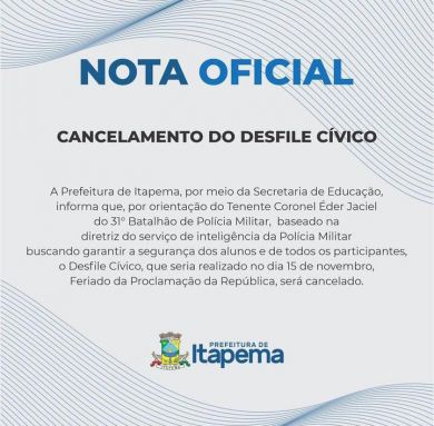 A prefeitura de Itapema emitiu um comunicado sobre o cancelamento do desfile cívico que estava marcado para a próxima terça-feira, 15, feriado de Proclamação da República. De acordo com a nota, o cancelamento foi uma orientação da Polícia Militar, buscando garantir a segurança dos alunos e participantes.