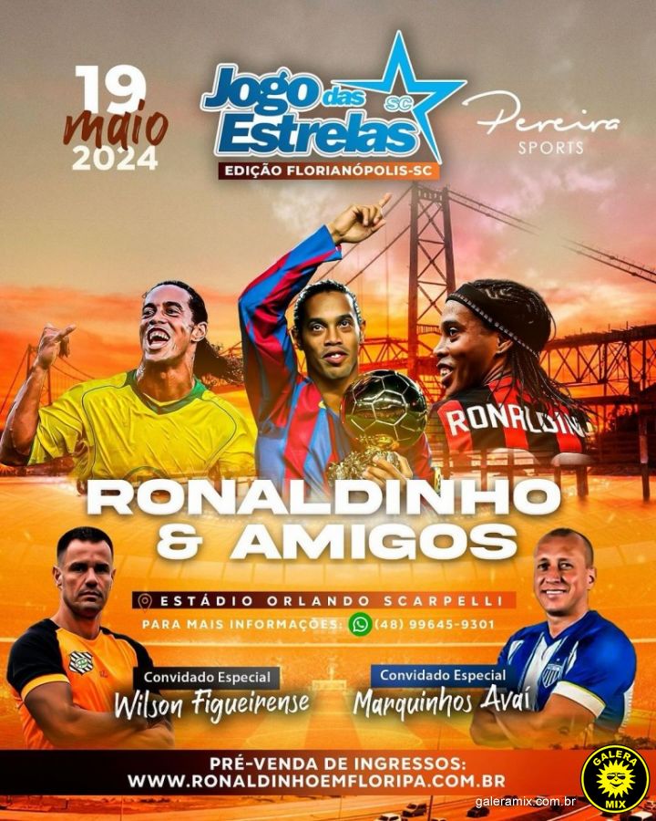 Jogo das Estrelas em Floripa no dia 19/05, tem Ronaldinho Gaúcho entre as atrações
