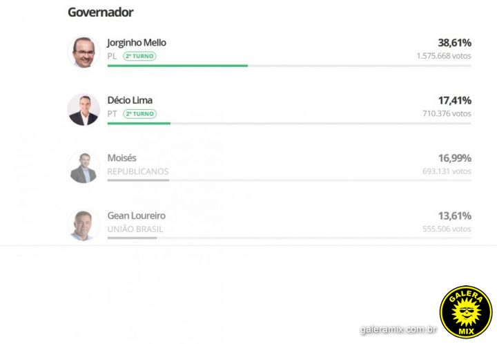 Os candidatos ao governo de Santa Catarina, Jorginho Mello (PL) e Décio Lima (PT) disputam o 2º turno em Santa Catarina. A informação foi confirmada pelo Tribunal Superior Eleitoral com 99,81% das urnas apuradas.