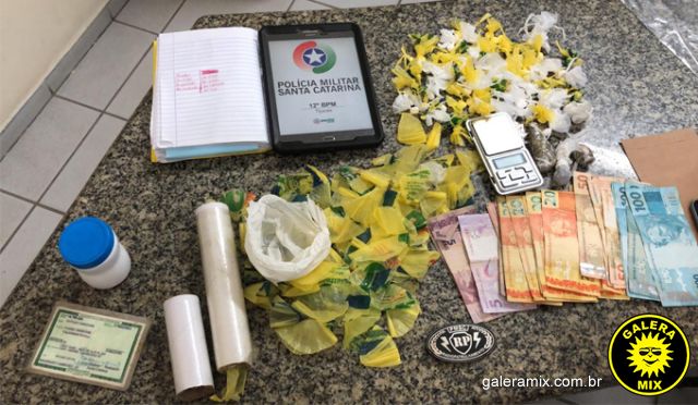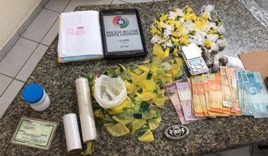 Os policiais encontraram na casa e em uma mochila do rapaz, 65 gramas de cocaína distribuídas em várias porções, duas buchas de maconha, um torrão de cocaína de aproximadamente 50 gramas, R$ 1 mil em dinheiro, uma balança de precisão e um caderno com anotações do tráfico.