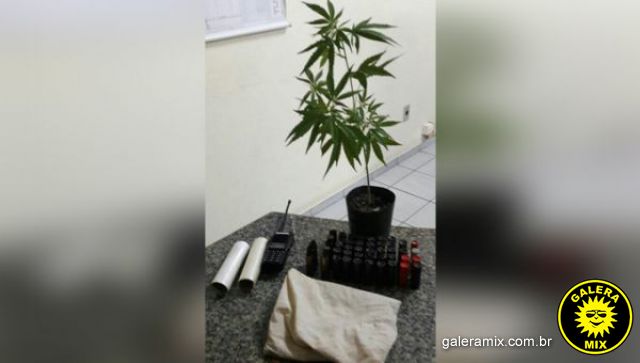Ao realizarem buscas pessoais os Policiais encontraram com o jovem um Rádio comunicador, um celular, cerca de 46 munições de diversos calibres, um pé de maconha e dois rolos de plástico comumente usados para embalar drogas.