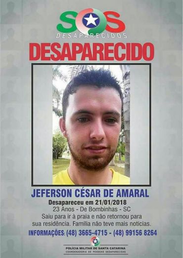 A família de Jeferson segue a procura desesperadamente por informações que possam levar ao seu paradeiro. O jovem, que estaria vestindo uma blusa de cor verde, teria ido caminhar na manhã de domingo (22), na praia do Mariscal, em Bombinhas e não mais retornou.