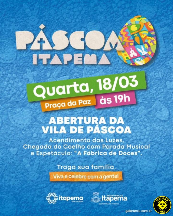 A programação oficial de Páscoa de Itapema será iniciada, nesta quarta-feira, 18 de março. A cerimônia de abertura está marcada para começar às 19h e promete reunir moradores e turistas em torno de atrações que combinam luzes, música e teatro.