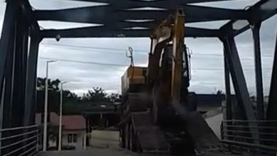 Um internauta registrou o momento em que uma máquina escavadeira, carregada em um caminhão, ficou presa na estrutura metálica da Ponte Bulcão Viana, em Tijucas. O caso aconteceu na tarde desta quinta-feira, 17 de dezembro.