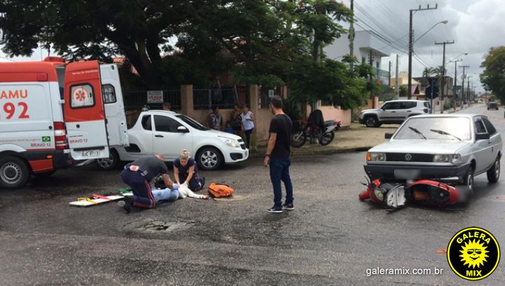Uma motocicleta Honda/Biz quase parou embaixo de um carro, após uma colisão no centro de Tijucas, nesta terça-feira (3), por volta das 12h30. A condutora da moto precisou ser encaminhada ao hospital.