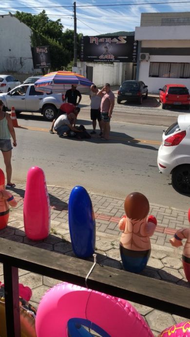 O condutor de um veículo com placas da Argentina que estava na fila abriu a porta do veículo e não percebeu uma moto, derrubando a mesma.