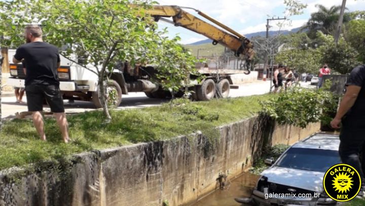 Um caminhão guindaste foi usado para retirar o veículo de dentro do córrego.