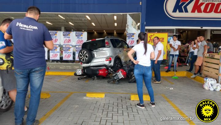 Funcionários e clientes do supermercado Koch, no Loteamento Mata Atlântica, levaram um susto na tarde desta sexta-feira (14), depois que uma motorista quase invadiu o estabelecimento de carro. O veículo passou por cima de várias motos e só parou após colidir com a vidraça da loja. Por sorte ninguém ficou ferido.