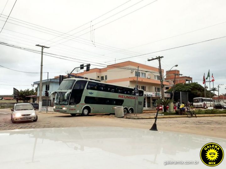 Ônibus fica preso em buraco ao sair da rodoviária de Tijucas