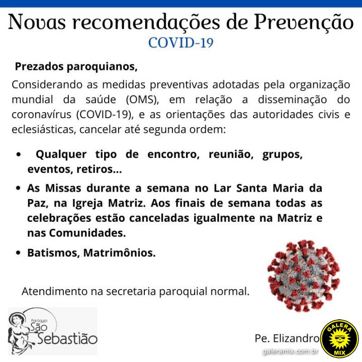 Devido as orientações decretadas por órgãos como a Prefeitura Municipal de Tijucas e a própria CNBB (Confederação Nacional dos Bispos do Brasil), a Paróquia São Sebastião de Tijucas informa a suspensão de todas as celebrações realizadas no município, a fim de evitar os eventos em que haja aglomeração de pessoas, para a prevenção ao Covid-19 (Coronavirus).