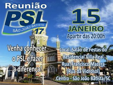 O encontro acontecerá a partir das 20h no salão de festas do residencial Villa Real, na rua Francisco Mazera (rua da Vidrossol) no Centro de São João Batista. Apoiadores da sigla no município que estão envolvidos com a expansão do PSL Batistense destacam a importância do encontro, pois haverá a oportunidade de filiações e espaço para manifestações de novas ideias.