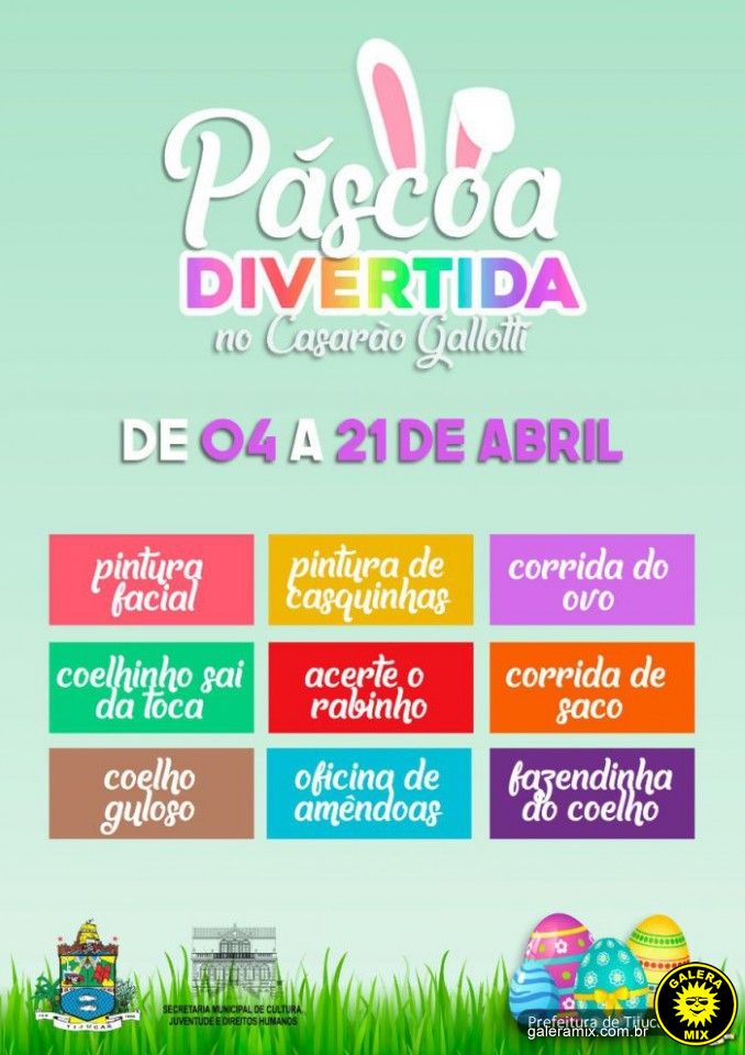 Começa na próxima quinta-feira (04) a programação da “Páscoa Divertida no Casarão Gallotti”. Durante o evento várias atividades serão oferecidas à comunidade, garantindo diversão para as famílias de Tijucas.