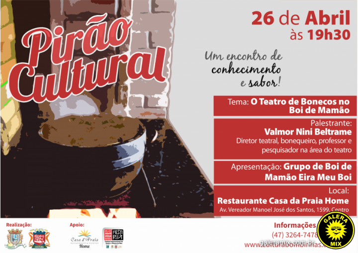 Acontece na noite de 26 de abril, quinta-feira, às 19h30, o Pirão Cultural com o tema "O Teatro de Bonecos no Boi de Mamão". O palestrante convidado é Valmor Nini Beltrame - diretor teatral, bonequeiro, professor e pesquisador na área do teatro.