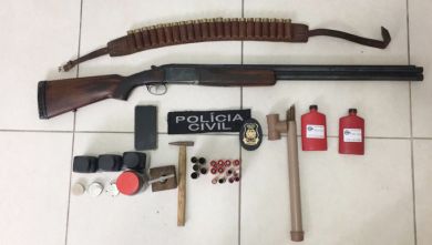 Os policiais foram até o local para cumprir um mandado de busca e apreensão no imóvel e acharam uma espingarda calibre 12, além de diversas munições e apetrechos para recarga.
