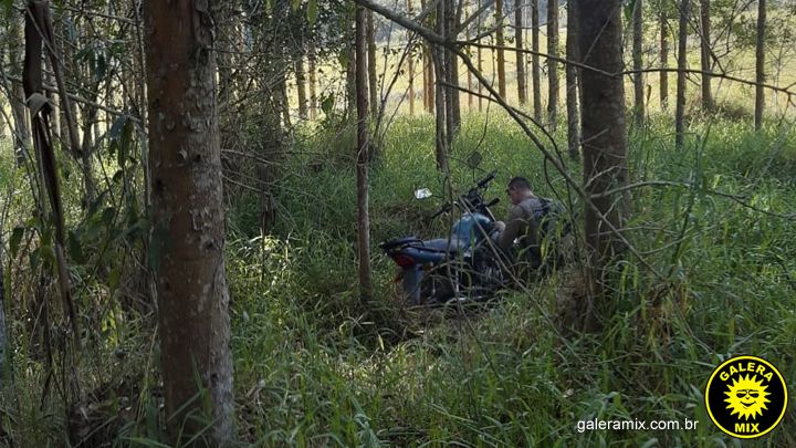 De acordo com informações da Polícia Militar, foram percorridos cerca de 400 metros em mata fechada para chegar até a motocicleta. Ela estava sem placa de identificação e roda traseira.