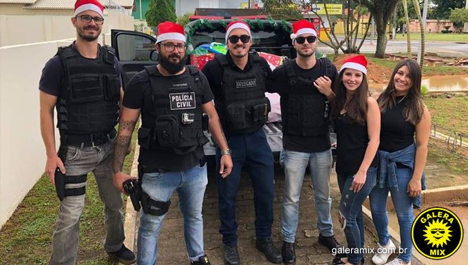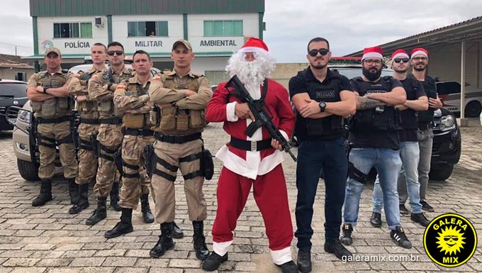 Um dos policiais, caracterizado de Papai Noel, fez a entrega dos presentes com a ajuda dos demais envolvidos.