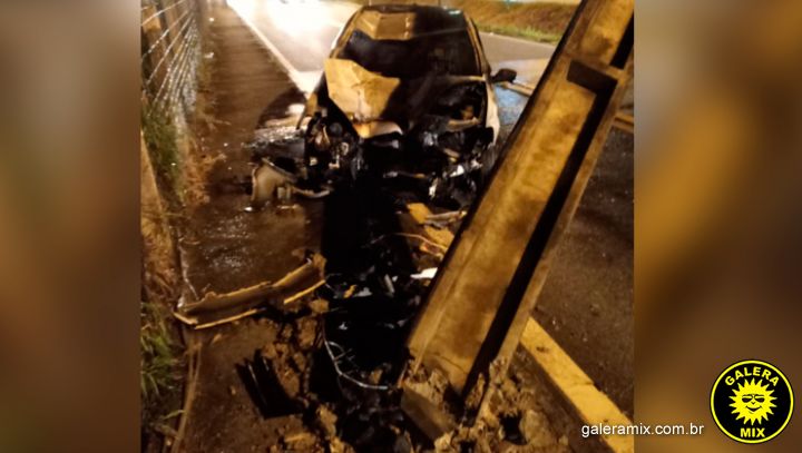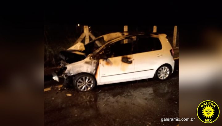 Na noite deste domingo (19), um veículo ficou totalmente destruído após o condutor colidir contra um poste da rede elétrica e o automóvel ser tomado pelas chamas. Duas pessoas ficaram feridas.