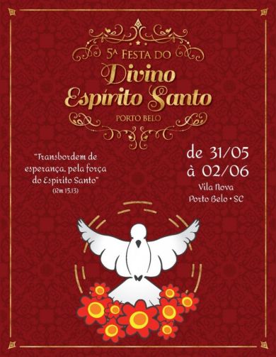 A Comunidade Divino Espírito Santo, do bairro Vila Nova, em Porto Belo, promove a 5ª Festa do Divino Espírito Santo, este ano com o tema “Transbordem de esperança, pela força do Espírito Santo” (Rm 15,13).