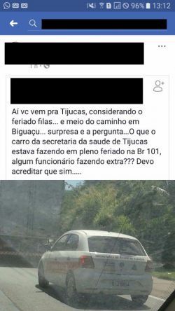 A secretaria municipal de Saúde esclarece que o referido veículo estava sim, transitando a trabalho neste feriado, assim como outros 4 veículos da frota da saúde que também foram utilizados para transporte de pacientes neste dia 15.