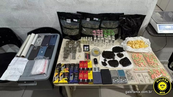 Entre os entorpecentes apreendidos estavam aproximadamente 955 gramas de skunk, 384 gramas de crumble, 515 gramas de dry, 607 unidades de ecstasy, 264 gramas de maconha divididas em 13 embalagens prontas para a venda, além de 24 gramas de MDMA. Também foram encontrados dez frascos de loló e 16 refis de óleo de THC.