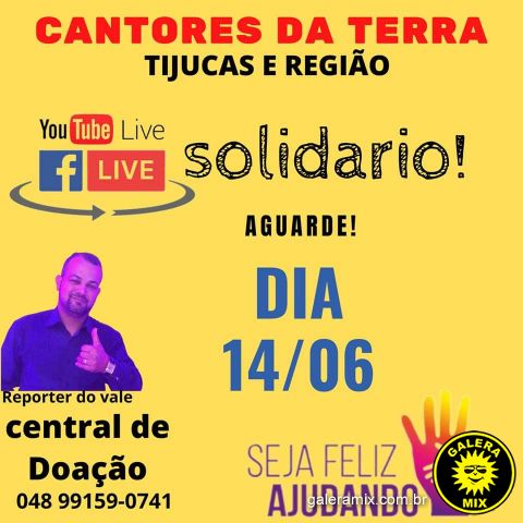 A live solidaria dos artistas da terra, que será transmitida do Rancho Limeira em Tijucas e acontecerá no próximo dia 14 de junho. Também oferecerá um delicioso carreteiro, no valor de R$ 15,000, onde parte da renda será revertida na compra de cestas básicas. Para garantir a sua fitinha para o carreteiro, entre em contato pelo whatsapp: (48) - 9-9159-0741.