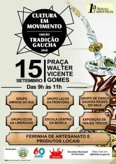A cultura gauchesca estará em evidência neste sábado (15), na Praça Deputado Walter Gomes (em frente à prefeitura) em São João Batista. Das 9h às 11h, será realizada uma edição especial do “Cultura em Movimento” em celebração à Semana Farroupilha, atendendo à Lei Municipal nº 3.740/2017. O evento é promovido pela administração municipal de São João Batista, por meio da Fundação Municipal da Juventude (Funjuve) e Secretaria Municipal da Educação.