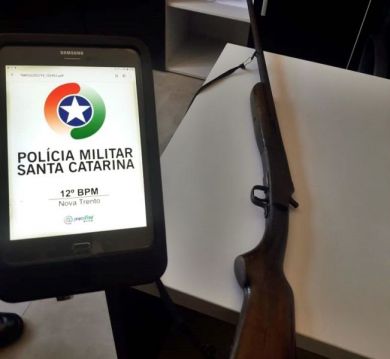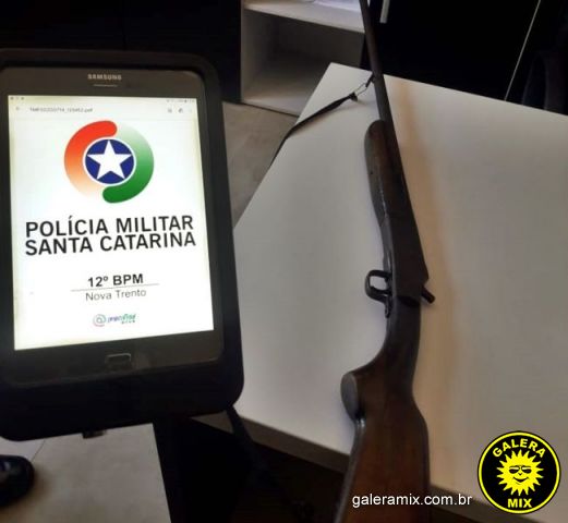 Em buscas feitas pelo local foi localizada uma espingarda calibre 32, diante da situação foi dada voz de prisão ao autor e feita a condução do mesmo para a Delegacia de Polícia Civil de Nova Trento par aos procedimentos cabíveis.