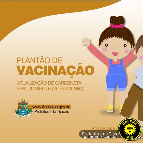 A Secretaria de Saúde de Tijucas está realizando a Campanha de Vacinação contra Poliomielite (para crianças de 1 ano a menores de 5 anos de idade) e também atualizando a caderneta de crianças e adolescentes com até 14 anos de idade. Neste sábado (13), das 8h às 16h, haverá plantão para imunizações nas Unidades Básicas de Saúde (UBS) das seguintes localidades: Morretes, Santa Luzia, Sul do Rio e Campo Novo.