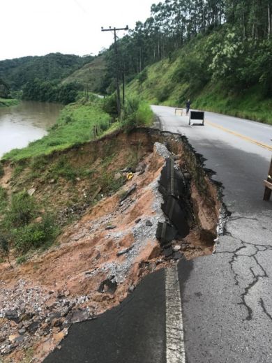 Após oito meses quando a chuva destruiu metade da faixa da rodovia no km 165.500 da SC-108, em São João Batista, na Grande Florianópolis, a via segue sem previsão de solução por parte do Departamento Estadual de Infraestrutura (Deinfra), responsável pela manutenção do trecho. Neste período, outras rachaduras se formaram no asfalto e o risco de desabamento aumentou por causa da falta de reparos.