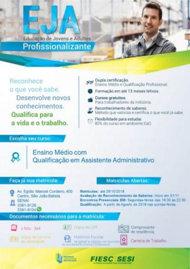 Quem tem o sonho de concluir os seus estudos e ainda realizar uma capacitação profissional, terá a oportunidade de unir os dois, de forma gratuita, através do novo EJA (Educação para Jovens e Adultos) Profissionalizante, uma parceria promovida na região entre o Sesi e o Senai,