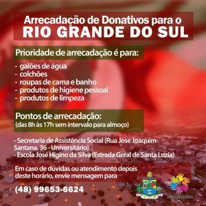 A Administração Municipal de Tijucas, solidária aos moradores do Rio Grande do Sul, afetados pela enchente, está arrecadando donativos para envio ao estado vizinho.