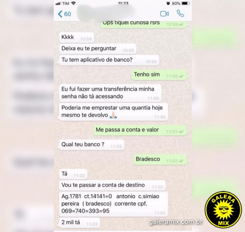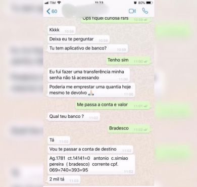 Numa das conversas, o bandido, se passando pela vítima, pergunta se a vítima possuí aplicativo bancário no celular e pede um empréstimo no valor de R$ 2.000,00. As vítimas neste momento estão acionando as autoridades para tomar as medidas cabíveis e tentar identificar os criminosos.